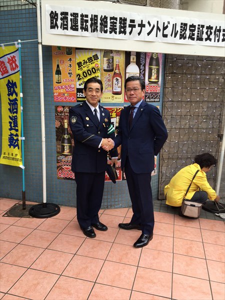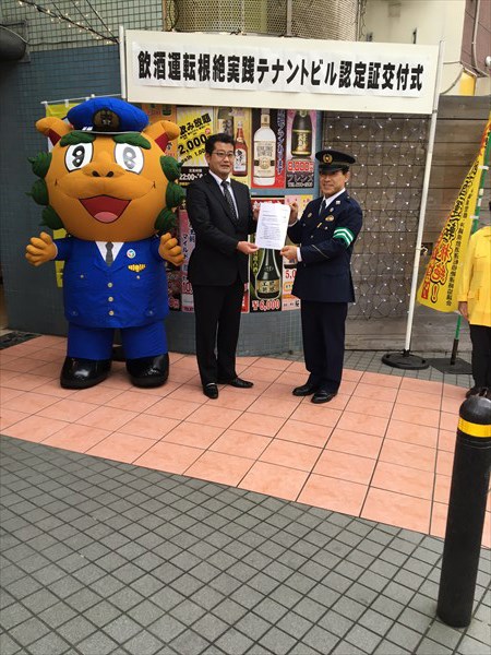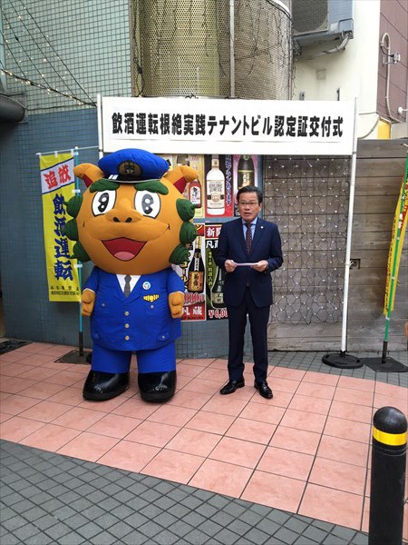 2016年12月16日に、県内初「飲酒運転根絶実践テナントビル認定式」が執り行われました。 趣旨は、飲食店が入居するテナントビルの管理者が「飲酒運転根絶」啓発活動に積極的に参加する。